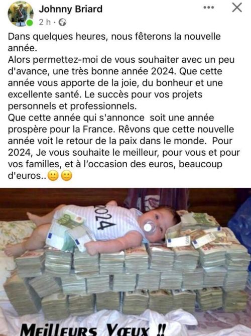 MISE A JOUR DU 07.01.2024 : Notre Phare de la Touques a adressé ses voeux à la populace avant les bizous de minuit, ça peut être pardonné s'il en avait un bon coup dans le nez. S'il était à jeun, il va falloir se cotiser pour lui payer une consultation chez un psy, et lui offrir une camisole pour ses étrennes. On est en effet dans le registre lapsus significatif : souhaiter une bonne année avec une illustration pareille est indécent et incongru. Son inconscient, si tant est qu'il soit parfois conscient, s'est lâché sévèrement. L'effet est garanti sur le petit peuple qu'il méprise au point de passer son temps à l'emmerder avec son plan vélo à la con, ses délires d'écluses et de coussins germaniques, de percées inutiles, de génocide de places de stationnement etc... Si le bébé est sur un matelas de pognon, le pognon peut aussi se trouver sous les matelas, et à une glorieuse époque dans les lessiveuses. Aurait il quelque chose à se reprocher fiscalement ? En tous cas, il se fait allumer par un de ses copains :