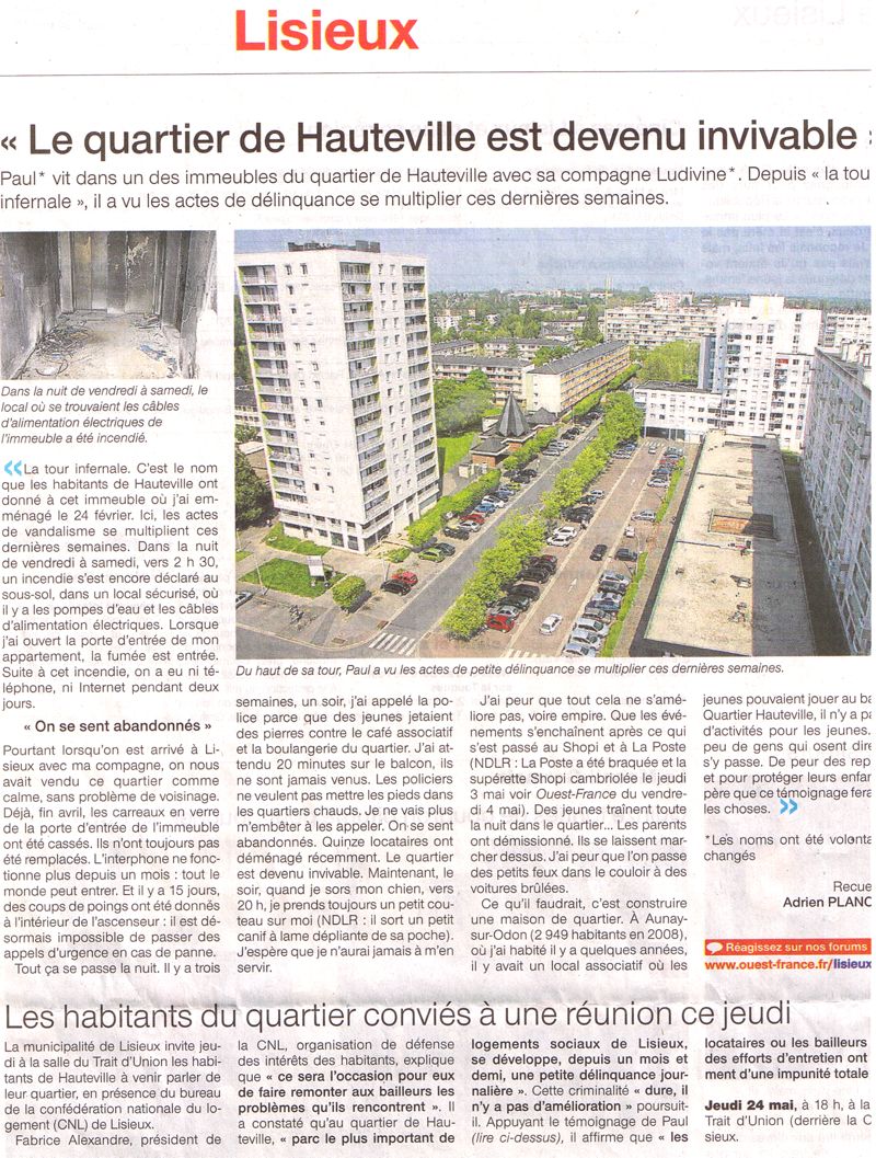 MAJ 24.05 : En effet, on en est au quatrième incident grave depuis la fameuse nuit de la Saint Sylvestre 2009. En excellent article est paru aujourd'hui dans OUEST FRANCE, où tout est exact, et vient corroborer les propos de l'Echo Joli. Gloire à toi Echo Joli, le sobriquet TOUR INFERNALE a été repris par le grand quotidien régional ! Le voici (cliquer sur la miniature) :