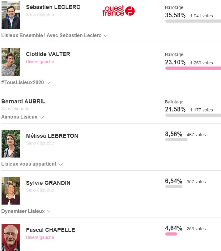 MISE A JOUR DU 18.06.2020 : Bon, nous sommes à huit jours d'un scrutin quand même très particulier. Comme je l'ai déjà dit, s'il y a eu quelques soupçons de personnes contaminées au début, personne n'est porteur à Lisieux, ou alors faut le dire. Je pense en particulier à SUPER MENTEUR, qui est quand même président du conseil de surveillance de l'hôpital, et qui peut donc informer objectivement la population. Au lieu de cela, il ment par omission, car cela lui permet de surfer sur le contrôle social, de jouer les petits pères des peuples protégeant ses ouailles mortes de trouille. Au passage, cela ne l'a pas empêché de briller par son absence lors de la manif contre la fermeture du pôle médecine générale. Bon, l'activité essentielle pendant la crise était l'IVG avec la pilule miracle censée sauver l'humanité du déferlement migratoire, la fameuse RU486. Revenons à nos moutons pour faire quelques pronostics, très difficiles du fait d'un abstention massive au premier tour, et une incertitude totale quant à la participation au deuxième, les ex-confinés ayant un peu la tête ailleurs. En tant que maire sortant, SUPER MENTEUR s'est ramassé une gamelle à 21.6%, un véritable désaveu. Irrattrapable. Du fait de la dynamique de la défaite, il va perdre encore et terminer en eau de boudin à 15%. Sa gestion débile de la crise du Covid (suppression du marché) et son incapacité à remettre en route rapidement les services publics va lui coûter cher. A ma gauche, CLOTILDE VALTER, une crypto-socialiste sectaire que nous avait amené la harpie "féministe" hystérique Yvette ROUDY, a fait un score correct compte tenu de l'état délabré du PS. Pascal CHAPELLE, autre crypto, mais cette fois coco, qui se prend pour un écolo, pastèque typique (vert à l'extérieur et rouge sang du goulag à l'intérieur) reste muet comme une carpe. Par certain que la totalité des voix, 4.63%, se reporte sur la liste Valter. Clotilde VALTER a de très grosses casseroles : chouchoute de la Hollandie, ministre PS, rédactrice de la Loi El-Khomeri, et probablement de la saloperie de loi Avia, c'est l'énarque type, membre de l'oligarchie qui mène le pays à sa perte par l'idéologie mondialiste du camp du bien. Mélissa LEBRETON, comme nous l'avons déjà dit, ne donne pas de consigne de vote, autant dire que c'est une consigne négative, d'autant plus qu'elle va savonner la planche, du fait de crêpages de chignons justifiés. Elle s'était présentée comme soutenue par LaREM au départ. Si elle avait appelé à voter Valter, 70% auraient suivi. Maintenant je table plutôt sur 50/50 voire 40/60. Le déchet se reportant sur Sébastien LECLERC. Le cas GRANDIN est plus difficile à cerner. Meneuse de revue à la baguette, cette femme de caractère (je n'ai pas dit bourrique) avait réuni une liste à sa botte, en sachant très bien qu'elle seule avait une chance d'être élue, car son objectif était clair : aller à l'agglo pour continuer à y coller son brin. La preuve : elle a intégré seule la liste de Valter, sans demander leur avis à ses colistiers, qui ont quand même été prévenus après la bagarre. S'étant présentée comme une liste citoyenne, ayant toujours été perçue comme droite modérée ou centriste, là aussi, ses électeurs ne vont pas se jeter dans les bras du marxisme. Son caractère de tornade ambulante va faire des étincelles avec celui de sa tête de liste qui n'a pas la réputation d'être une commode. Comme je l'ai déjà dit, ça va se terminer à coups de parapluie ou de sacs à main. Son arrivée sur la liste Valter va sans doute être neutre (autant de voix perdues que gagnées). Résumons : Valter 23 + Lebreton 4 + Grandin 3.5 + Chapelle 3.5 = 34%. De son côté, Sébastien LECLERC va bénéficier de toutes façons de reports : Leclerc 35.6 + Aubril 3 à 5 + Lebreton 4.5 + Grandin 3 + Chapelle 1, à la grosse 44%. La messe est dite. Mais ce n'est pas très brillant, avec un inconvénient : l'opposition va faire le plein de conseillers, dont certains iront à l'agglo. Sa candidature à la présidence de l'agglo en est d'autant plus compromise. Que vont faire les électeurs du RN et des souverainistes, rappel 33% aux Européennes ? Sûrement pas voter VALTER, la chienlit actuelle de la Macronie à l'agonie vient en fait de loin, en particulier du quinquennat catastrophique de Hollande. Sûrement pas SUPER MENTEUR, car le vote massif RN dans les quartiers populaires est une conséquence de son arrogance et du désastre de l'ANRU II, qu'il a concocté avec son éminence noire Paul Mercier. La consigne que j'ai déjà donnée est toujours valable : TSA, tout sauf Aubril. Conclusion : les voix RN iront majoritairement sur le candidat LR (bien qu"une partie retournera au bercail socialiste), qui sera élu PAR DÉFAUT, comme le moins pire. Difficile ensuite d'asseoir son autorité si la participation est faible. Personnellement, je voterai Sébastien LECLERC, ce qui ne m'empêchera pas une nouvelle fois de continuer le travail d'opposition politique, si possible constructive, à la fois au plan local, mais aussi au plan national. Il le sait, je le lui ai dit entre quatre yeux. Nous avions convenus, et pas qu'avec lui, de faire une campagne correcte, autant continuer. D'autant plus que se profilent les départementales, et les régionales, sauf si la Macronie magouille encore pour manipuler les scrutins. On saura d'ailleurs rapidement s'il tient le choc, car vu le capharnaüm que laissent les pieds nickelés derrière eux, la gestion de l'après confinement, les opposantes de choc et le RN dans les pieds, ça va pas être du gâteau. Signalons toutefois le communiqué officiel du référent RN du Calvados. Il faut l'interpréter comme une déclinaison de la position nationale. En effet, de nombreux candidats LR tirent dans les pattes des candidats RN en faisant des alliances et désistements contre nature. Ce qui ne les emmènera pas en paradis. Soyons cla