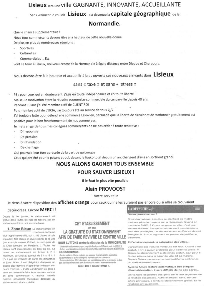 MAJ du 31.08.2018 : Les affiches oranges d'Alain Provoost (PIZZA PASTA) réclamant le stationnement gratuit sont bien visibles dans plus de 100 commerces (350 distribuées). Cela au moment ou les nouvelles règles de stationnement vont être mises en place. Cela a rendu le roitelet complètement furax, ce qui n'est pas vraiment bon pour son tronc vermoulu. Il a donc déboulé avec sa marquise de Montespan dans le quartier de la place du Pays d'Auge, pour se fritter sévère avec les commerçants de la place, dont l'imprimeur de la fameuse affiche. Noms d'oiseaux, menaces de plaintes, amabilités diverses, et oui les gars, le vrai Nanard, c'est ça. Les commentaires vont de "complètement cinglé", "à la masse" à "ce type est dingue". Autre preuve que ça va pas vraiment bien sous la casquette du VCL : un fleuriste a reçu un coup de fil, s'est fait engueuler comme une rose pourrie, et "je ne viendrai plus acheter de fleurs chez vous". Réponse, je m'en tape. Gueule des #pétassananard. Au moins c'est clair. Au fait, c'est pas Johnny Be Bad, qui va du coup récupérer un client vu ses cirages de pompes. Il a déjà dans sa clientèle le véritable maire, Frédo cinq zéros. Des commerçants agressés envisageraient de déposer plainte, à confirmer. Pour ce qui concerne le stationnement la semaine prochaine, on va les voir à l'oeuvre.